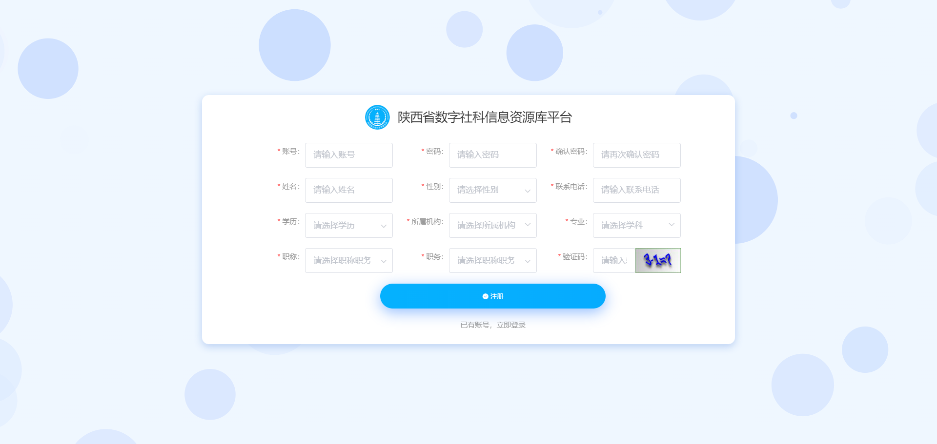 系统网址https://sksj.sxsskw.org.cn/,进入【登录页】,点击登录页中【暂无账号,立即注册】,进入注册页面,进行注册。输入对应数据后提交审核。已有账号的,输入社科人才账号密码进入人才首页,可正常登录。