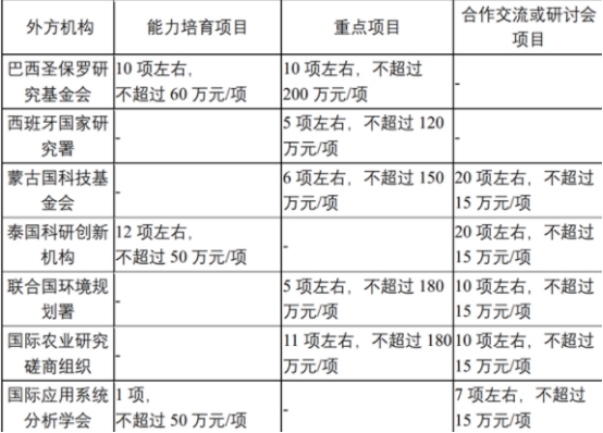 “能力培育项目”旨在支持中外科研人员培育合作关系,可开展包括合作研究、野外考察等多种形式的研究活动。“重点项目”旨在资助中外科研人员在选定领域开展合作研究,共同培养杰出科技人才和解决区域性科学问题,促进提升地区的科研水平与世界影响力。“合作交流项目”旨在支持中外科研人员开展能力建设,可开展包括互访、讲习/培训班等多种交流活动。“研讨会项目”旨在支持中外科研人员召开在华会议及出国会议。